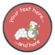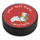 A little penguin cartoon with santa hat and green scarf waving in front of a snowball stack.