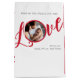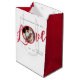 This design features a merry Christmas cute calligraphy script gift bag with a love calligraphy script lettering, family photo picture template, a red and white typography design, stylish trendy calligraphy script font, Christmas holiday wrapping supplies, custom customised gift message greeting, Christmas holiday paper gift packaging, simplistic party favour gift packaging, classic classy traditional winter design