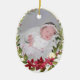 This elegant holiday ornament features your favourite photo in a gold and poinsettia frame. Back features custom text in a gold and poinsettia frame. Makes a great keepsake for a first Christmas.