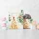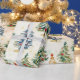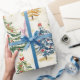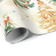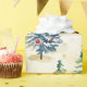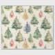 Be a bit more festive and colourful with your pine trees wrapping paper choice when you use this festive pattern. Not only do you have lovely green vintage watercolors, intermixed are unexpected and pretty coloured trees in muted but fun pink, red, blue, and yellow. All decorated for the Christmas holidays with stars or bows at the tops and shiny baubles, even though pictured out in the winter snow.