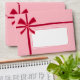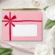 This Christmas envelope design features a red bow and a blank address label on the front, an editable return address label on the back, and a Christmas presents pattern on the lining. Original artwork by Marketa Stengl.