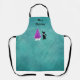 This kitchen apron is a pretty teal colour with a pink and silver glittery look Christmas tree on a white star shaped rug with a black cat beside the tree wearing a pink bow. Customise your text with the template.