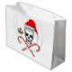 Pirate skull wearing Santa hat with YO-HO-HO written on hat. A pair of crossed candy canes are under the skull. Includes a Christmas pirate ship next to the skull.