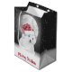 Polar bear with Christmas Santa Claus cap on black sky with snowflakes and full moon.