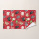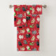 Cute Christmas dogs in festive holiday outfits. Pomeranian with cream, black, tan, grey and chocolate coats wear Santa hats, antlers, sweaters on a red background with scattered ornaments bath towel set.