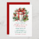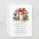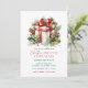 Create your ideal Christmas presents opening party invitation featuring a lively and festive Christmas present box embellished with vivid decorations, enhanced by an elegant red cursive font. Personalise it with party details in a mix of dark green and red hues to suit your party information.