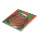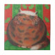 A happy tortoiseshell cat (resembling a christmas pudding!) sits on a green cushion against a red and green holly leaf patterned background. Tile with a customisable for you to personalise with your own text, message or images. An original coloured-pencil drawing by Jess Perry.
