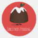 Stickers with a smiling, Christmas Pudding, cartoon character. The words can be customised.