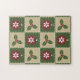 Four squares in green and tan are adorned with red ornaments decorated with white snowflakes and green holly with red berries. White stitching adds a decorative touch, giving the repeating pattern the appearance of a quilt, creating a perfectly cosy feeling for the Christmas holiday.