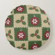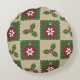 Four squares in green and tan are adorned with red ornaments decorated with white snowflakes and green holly with red berries. White stitching adds a decorative touch, giving the repeating pattern the appearance of a quilt, creating a perfectly cosy feeling for the Christmas holiday.