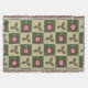 Four squares in green and tan are adorned with red ornaments decorated with white snowflakes and green holly with red berries. White stitching adds a decorative touch, giving the repeating pattern the appearance of a quilt, creating a perfectly cosy feeling for the Christmas holiday.