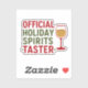 Quote: Official Holiday Spirits Taster. Red, green text. Decorated with a glass of wine