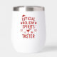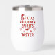 Quote: Official Holiday Spirits Taster. Red text. Decorated with glasses of wine, Santa's hat, coctail glass and snow crystals,