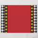 Dogtooth, Houndstooth or pied-de-poule pattern is a 2 colour pattern traditionally used in textile design, is chraacterised by four-pointed shapes, often in black and white. The products in this range use the classic houndstooth pattern toped by a red disc, a black rim with yellow dots for you to customise with a name Date or initials.