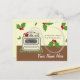 A postcard featuring a background of brown with green trim at bottom. Illustration of a retro beige stove sitting on a festive red and green floor. A red kettle sits on the front left burner of the stove. Holly illustrations at top over beige background. Write your recipe on back.