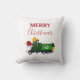 A cute illustration of a Christmas recycling garbage truck wearing a Santa hat and decorated in Christmas lights with words "Merry Christmas". An ideal Christmas pillow design for garbage truck enthusiasts big or small, girls or boys.