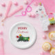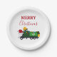 A cute illustration of a Christmas recycling garbage truck wearing a Santa hat and decorated in Christmas lights with words "Merry Christmas". An ideal Christmas paper plate design for garbage truck enthusiasts big or small, girls or boys.