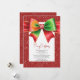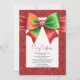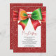Christmas red and green bow and snowflakes party holiday card. Set the perfect festive tone with this charming Christmas card! The classic red and green palette centers around a large, eye-catching coquette bow, beautifully anchored by a sparkling snowflake. This joyful design is then framed by a wide, deep red border scattered with crisp white snowflakes.