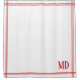 This elegant white shower curtain features red stripes along with customisable initials simply placed on the corner.