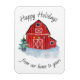 Holiday watercolor scene features country red barn with Christmas lights and decorated tree and "Happy Holidays from our home to yours" customisable text