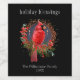Make this holiday season extra special with this beautiful watercolor design that features a red cardinal bird against a dark night sky with a crescent moon and gold stars, twig wreath, red holly berries, pine cones, greenery, yule candles with a gold flame and finished with a red bow
