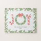 This Christmas candy cane joy and wreath jigsaw puzzle is perfect for a holiday family gathering. This beautiful design features hand-painted watercolor red and white candy canes and a greenery wreath with a lovely red bow. The frame is an elegant watercolor green and red holly. Part of the Candy Cane Joy collection. (Personalise family name and date)