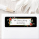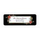 Christmas holiday return address label depicts elegant floral watercolor designs including a festive gold frame adorned with red poinsettia flowers and greenery on a black and white background.
