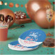 Cute prancing reindeer jumping over Christmas presents with snow and stars, graphic Christmas paper plates in shades of bright blue, red and white. Personalise with your own family name or greeting. Ideal for Christmas parties.