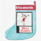 A Christmas stocking with a cute whimsical illustration of a funny Christmas reindeer in an ugly sweater, perfect for the holiday season. He is standing on 2 legs and waving hello. He has big antlers and a cute green knitted winter cap. Text below says Merry Christmas in a handwritten font in a festive red colour. Personalise with a name on the front and back. The background is a blue frosty icy looking watercolor design.