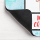 Mousepad with a cute whimsical illustration of a funny Christmas reindeer in an ugly sweater, perfect for the holiday season. He is standing on 2 legs and waving hello. He has big antlers and a cute green knitted winter cap. Text below says Merry Christmas in a handwritten font in a festive red colour. The background is a blue frosty looking watercolor design.