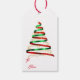This holiday gift tag is shown in a festive Christmas ribbon tree print.