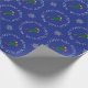 The text on this sport-themed wrapping paper is in white and can be edited for your preferred greeting, or simply use the supplied: "MERRY CHRISTMAS HAPPY NEW YEAR". The design shows a pictogram runner (in christmas green) wearing a santa hat and carrying a festive parcel. The background is navy, and there are golden-coloured snowflakes too.