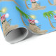 Cute snow sandman on the beach with sunglasses and stocking cap holding a holiday light string under Christmas palm tree