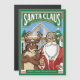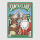 This Christmas design looks like an old playbill or movie poster that says "Santa Claus and the Kicking Reindeer." This retro Christmas design has a background featuring a church, a Christmas tree with snow, and snowflakes falling.