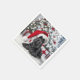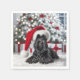 A black Scottish terrier dog is wearing a Santa hat while lying on a fluffy white fur rug.