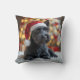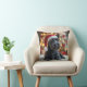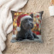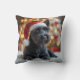 A black Scottish terrier dog wearing a Santa hat sits on a fluffy rug in front of a festive Christmas tree adorned with lights.
