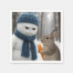 A grumpy snowman wearing a blue hat and scarf stands in a snowy forest as a rabbit holds a carrot beside it, with snow gently falling around them