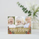 Hand lettered script with the words "Merry Christmas" on a gold background with red berries. Merry Christmas Gold 3 Photo Collage Holiday Card design by Elke Clarke © Inside of card has gold typography script on a white background with a holiday wreath watercolour design.