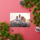 This simple full photo Christmas card features elegant modern script appearing in real gold foil on the front. The backside offers a boho winter greenery pattern appearing in soft tans and teals on a dark teal green background.