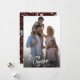 This vertical full photo Christmas card features elegant modern script and space on the back for a personal message. The backside offers a boho winter greenery pattern appearing in soft tans and teals on a deep dark burgundy background.