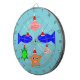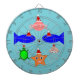 This awesome dart board features a collection of sea creatures wearing santa hats. The marine animals include a pair of blue fish, a cheeky looking little pink crab, a yellow starfish, a sparkly jellyfish and a cute little green turtle.