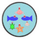 This awesome hockey puck features a collection of sea creatures wearing santa hats. The marine animals include a pair of blue fish, a cheeky looking little pink crab, a yellow starfish, a sparkly jellyfish and a cute little green turtle.