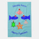 This awesome kitchen towel features a collection of sea creatures wearing santa hats. The marine animals include a pair of blue fish, a cheeky looking little pink crab, a yellow starfish, a sparkly jellyfish and a cute little green turtle.