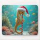 A seahorse wearing a Santa hat clings to a candy cane in an underwater scene