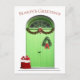 This Christmas holiday design features green double doors with a palladium topped window. There is evergreen garland below the window, a tree shaped wreath on the right door and a gift filled Santa bag on the steps. Personalise the text on the front and back, remove any text or click customise to select a different font style, size, and colour.