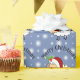 Cute cartoon fluffy white sheep with grey ears and a pink happy face. He is wearing a bright red Santa hat with a white trim and a white pompom. Above him in black lettering are the words "Merry Christmas". This is a template so you can leave as it is, change to your own message or delete to leave blank. The background is blue dotted with snowflakes