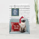 Siamese cat with Santa hat on a blue chair with a red pillow.