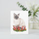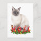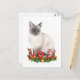 Great holiday design for cat lovers features watercolor portrait of white and grey Siamese cat with festive NOEL bottom border