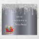 A faux silver metallic looking background with faux silver glitter drip, a bit of bling and luxury for a Christmas Party. Santa Claus' old vintage red sleigh filled with gifts as decoration. With the text: Christmas written with a modern hand lettered style script. Template for Your family name and year, white letters.