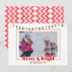 Bring the Merry & Bright to your Christmas cards this year with this snow photo overlay template card. Made with double rectangular borders one red one gold, and a string of colour Christmas lights at top. Templates created for you. A chevron styled red pattern on back.